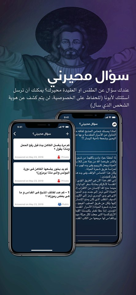 عند الضعط علي (+) سوف تظهر شاشة لكتابة السؤال و عند الإنتهاء سوف يتم إرسال رسالة و تنبيه خاصة إلى أبونا مرقص من خلال التطبيق. سوف يقوم أبونا مرقص من مراجعة السؤال و الرد عليه و يحق لأبونا برد على السؤال بشكل عام او بشكل خاص و يحق لأبونا من معرفة الشخص الذي أرسل السؤال. اذا قام أبونا برد عليه بشكل عام ، سوف يظهر السؤال مع الجواب إلى جميع المستخدمين و سيظهر علامة زرقاء بجانب السؤال لكن لن يتم إظهار إسم الشخص الذي سآل. ولكن إذا قام أبونا برد على السؤال بشكل شخصي، سوف يظهر السؤال مع الرد الى الشخص الذي سأل فقط و سيظهر علامة حمراء بجانب السؤال.