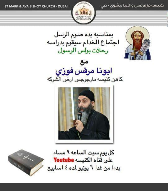دراسة رحلات بولس الرسول – أجتماع الخدامبواسطة Administrator / يونيو 5, 2020 بمناسبة بدء صوم الرسل اجتماع الخدام سيقوم دراسة رحلات بولس الرسول مع أبونا / مرقس فوزي كاهن كنيسة مارجرجس أرض الشركة كل يوم سبت الساعة 9 مساءً على قناة الكنيسة YouTube بدءاً من غداً السبت 6 يونيو لمدة 4 أسابيع