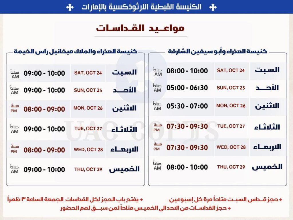 مواعيد القداسات الأسبوعية من 24 أكتوبر – 29 أكتوبر