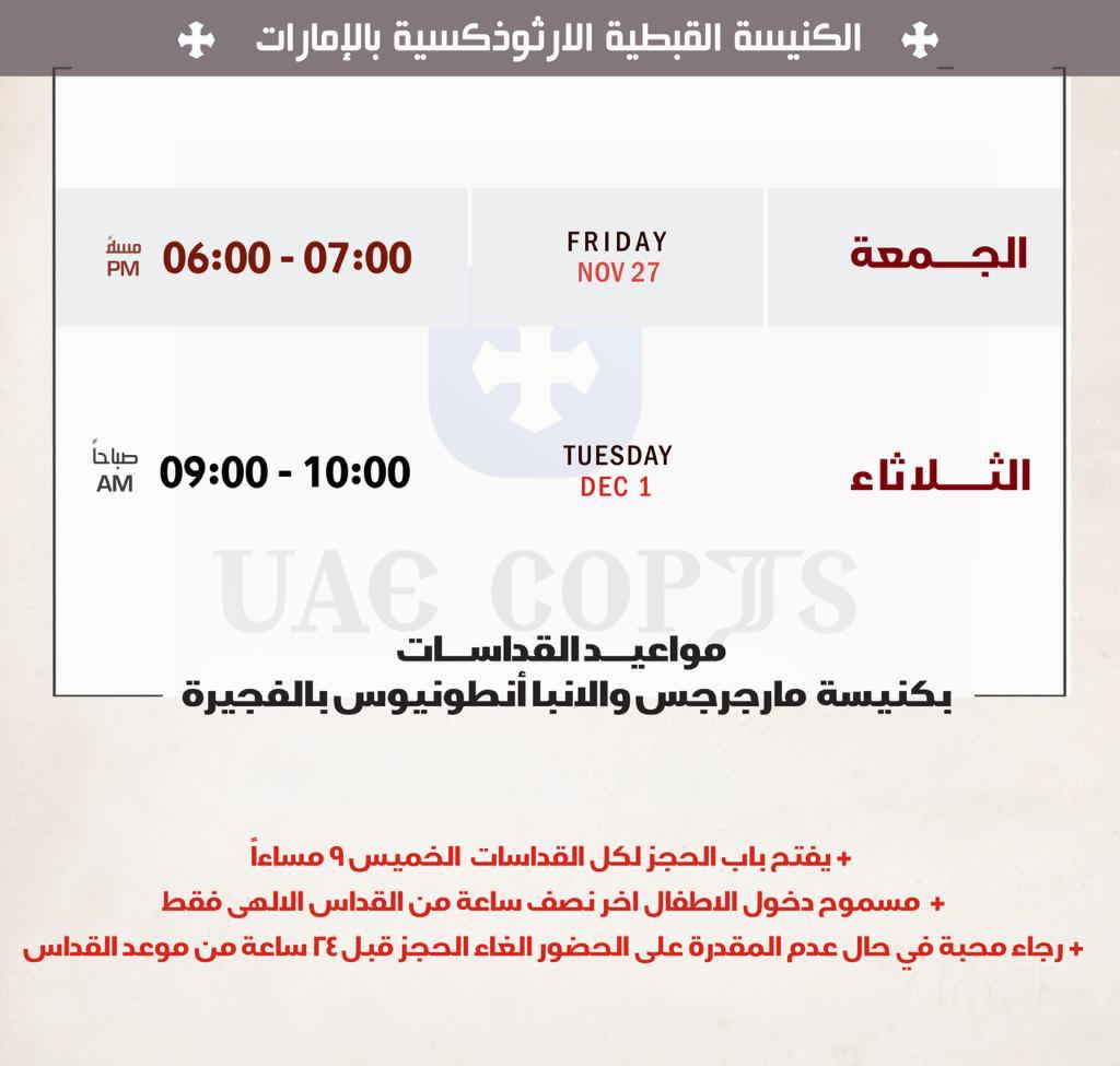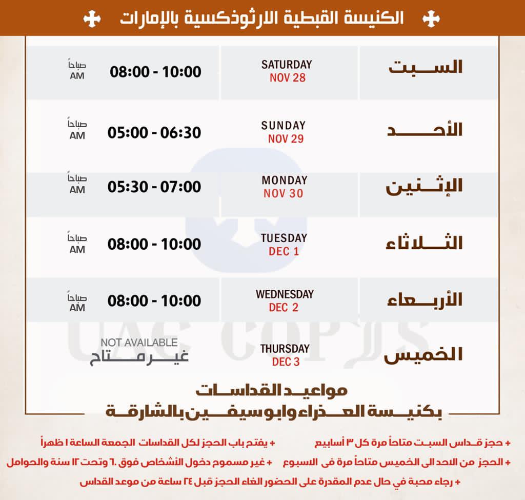 مواعيد القداسات الأسبوعية من 5 ديسمبر – 10 ديسمبر