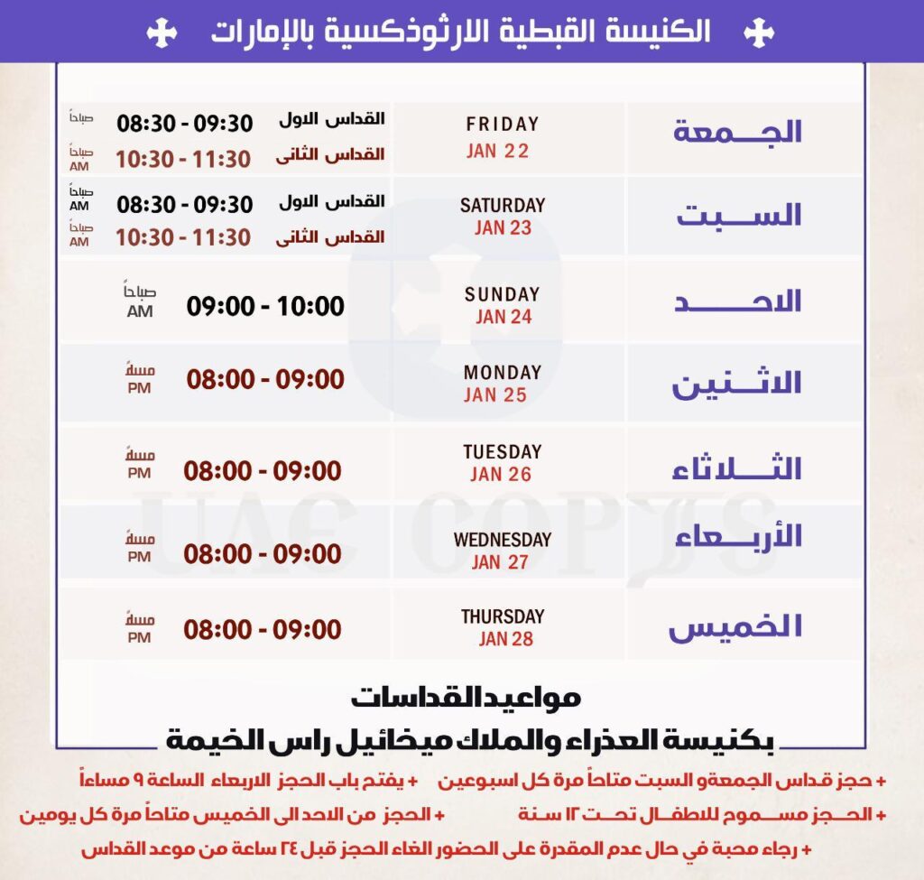 مواعيد القداسات الأسبوعية من 29 يناير – 4 فبراير
