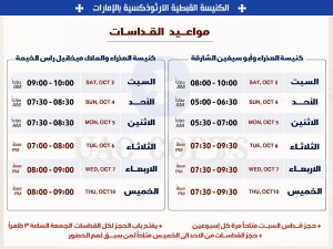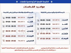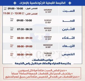 أخبار الكنيسة مواعيد القداسات الأسبوعية من ٣ أكتوبر – 8 أكتوبر اقرأ المزيد » أكتوبر 1, 2020 لا توجد تعليقات